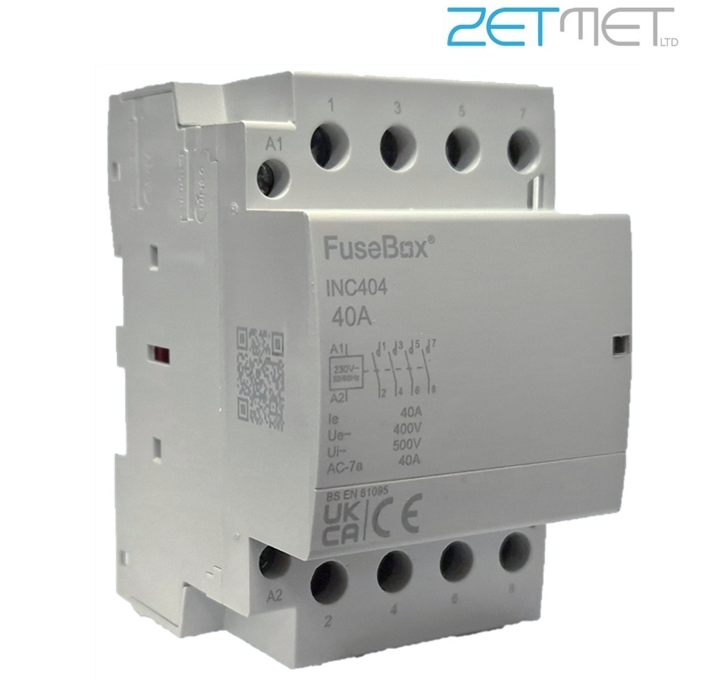 Double module normally open contactor brought to you by FuseBox. Designed for use within FuseBox Consumer Units, these contactors ensure reliable switching and management for a variety of electrical loads. Suitable for domestic and commercial applications. Supplied with 2 x 9mm heat dissipation spacers. This is the FuseBox INC404 40 Amp 4 Pole N/O Modular DIN Rail Contactor.